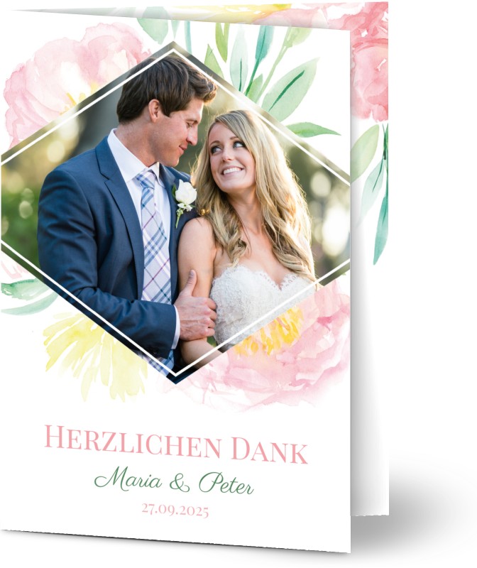 Diese Dankeskarte Hochzeit hat ein wasserfarbe Design in rosa Tönen. Dieses wundervolle Design beinhaltet ebenfalls Blumen und Aquarelle.