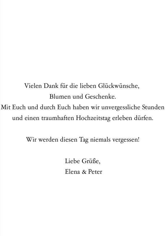 Ihr Hochzeitstag wäre nicht derselbe gewesen ohne die Teilnahme und Unterstützung Ihrer Freunde und Familie. Senden Sie ihnen eine personalisierte Dankeskarte zur Hochzeit. Personalisieren Sie ganz einfach Ihre Dankeskarten zur Hochzeit und machen Sie sie wirklich zu etwas Besonderem. Fügen Sie ohne Aufpreis Fotos und Texte zu jeder Seite der Optimalprint-Karte hinzu.