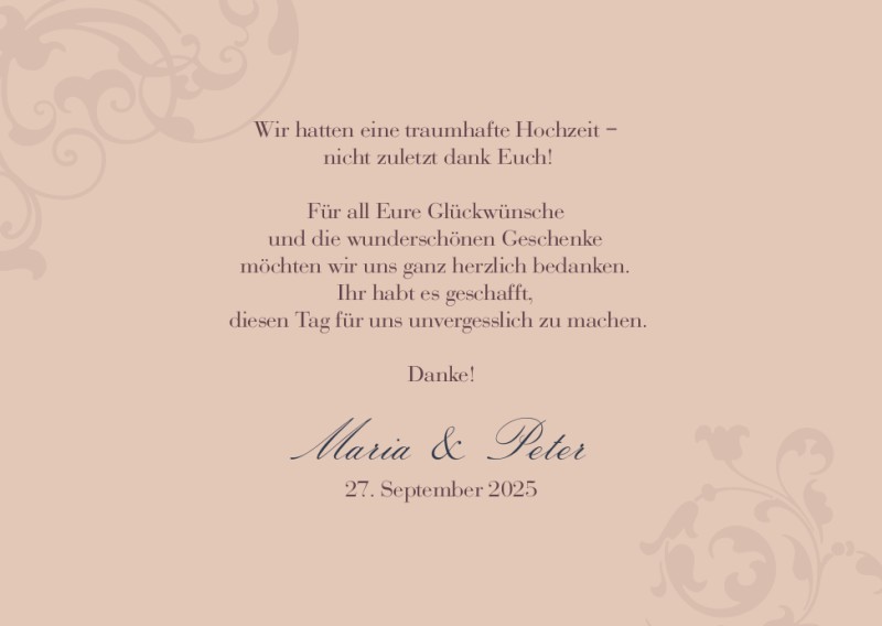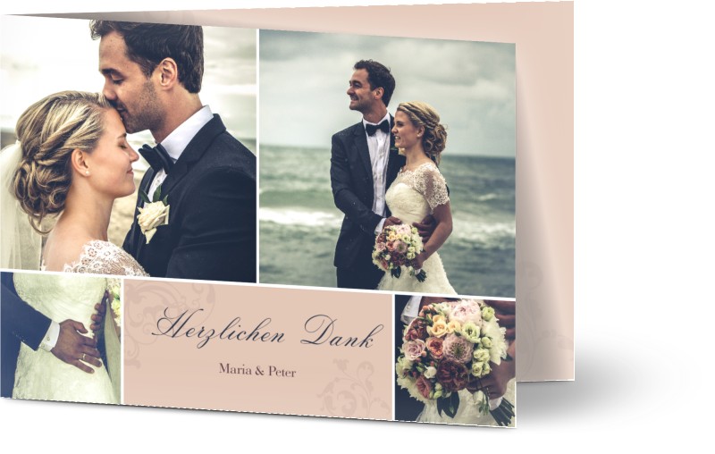 Ihr Hochzeitstag wäre nicht derselbe gewesen ohne die Teilnahme und Unterstützung Ihrer Freunde und Familie. Senden Sie ihnen eine personalisierte Dankeskarte zur Hochzeit. Personalisieren Sie ganz einfach Ihre Dankeskarten zur Hochzeit und machen Sie sie wirklich zu etwas Besonderem. Fügen Sie ohne Aufpreis Fotos und Texte zu jeder Seite der Optimalprint-Karte hinzu.
